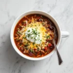 Lastly, serve the chili hot with optional toppings like sour cream and cheddar cheese for that extra flavor.