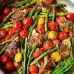 Cooking everything in one pan means less cleanup, which is always a plus after a long day. Each bite of tender chicken covered in vibrant basil pesto, paired with roasted cherry tomatoes and crisp asparagus, creates a meal that’s satisfying and full of color. It’s a dish that invites you to enjoy and relish the flavors while being quick enough to serve up on a hectic evening.